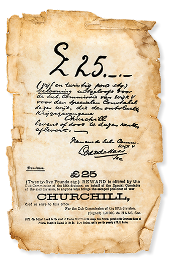 Wanted poster released after Churchill’s escape from the Boers, in Dutch with translation.